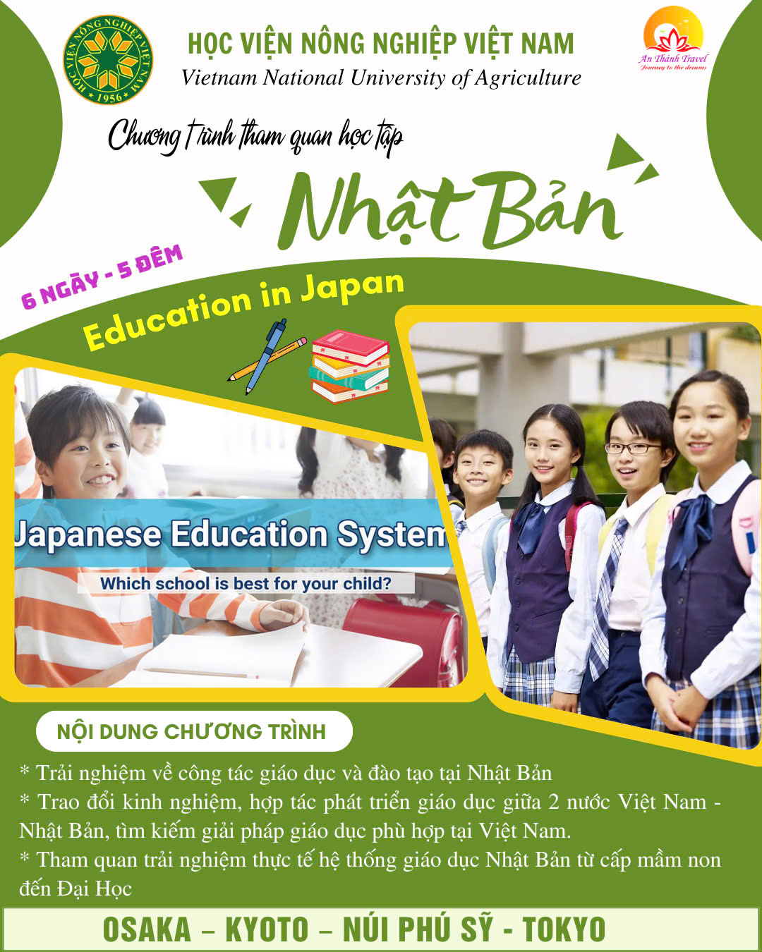 Chương trình do Học viện Nông nghiệp Việt Nam tổ chức nhằm mang đến cho người tham gia cơ hội trải nghiệm thực tế toàn diện về hệ thống giáo dục và đào tạo tại Nhật Bản, trải dài từ bậc mầm non đến đại học. Đây là dịp để các cán bộ, giảng viên và học viên được quan sát, học hỏi cách thức tổ chức, quản lý, cũng như các phương pháp giảng dạy hiện đại đang được áp dụng trong nền giáo dục tiên tiến của Nhật Bản.